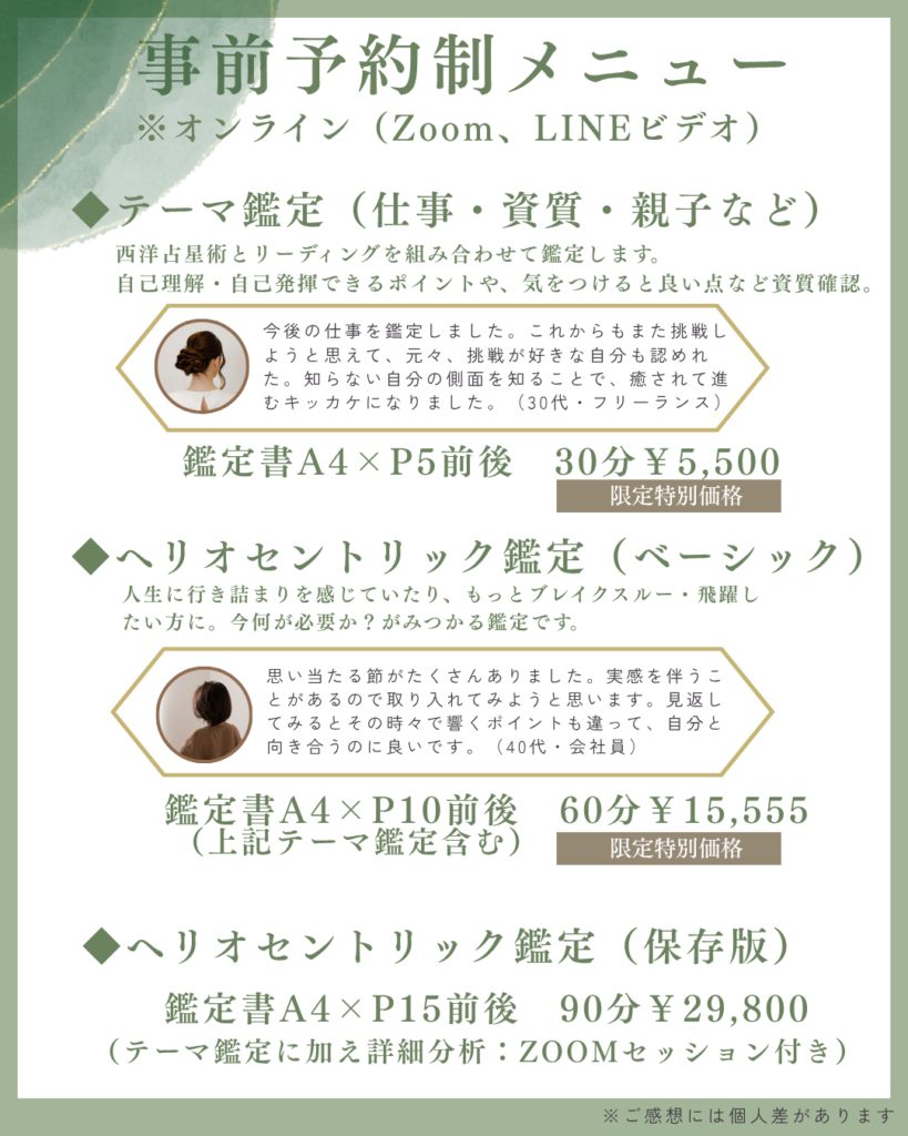 ※テーマ鑑定は、ご希望のテーマに沿って、一部をピックアップする形になります。へリオセントリック占星術、ジオセントリック占星術・ディグリー占星術・サビアン占星術、カードリーディングを組みあわせてオリジナルに鑑定書を作成しております。